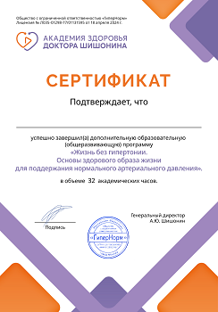 Врач-кардиолог (Первый Московский государственный медицинский университет имени И.М. Сеченова, г. Москва).
